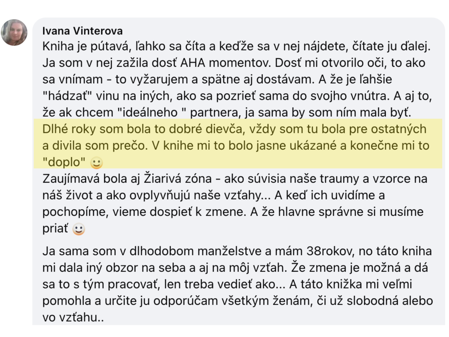 Som v šťastnom manželstve, ale pred 15 rokmi mi takáto kniha chýbala. Ušetrila by som si mnoho sklamaní. Viackrát som sa v nej našla – v opísaných situáciách, presvedčeniach aj opakujúcich sa vzoroch. Zaujalo ma porovnanie sebeckých princezien a Žiarivej zóny – silný AHA moment. Páčili sa mi praktické aktivity, najmä cvičenie so strachom a s úsmevom.