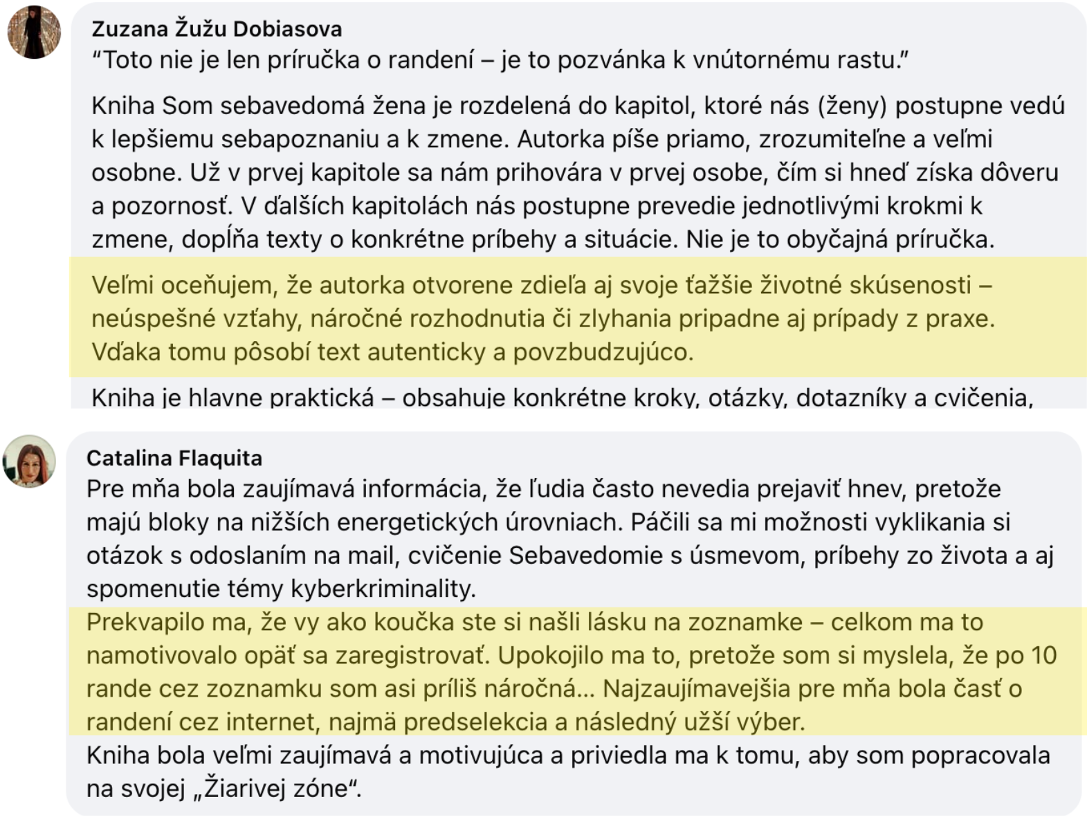 "Napriek tomu, že mám naštudované množstvo sebarozvojovej, psychologickej aj vzťahovej literatúry, táto kniha mi priniesla mnoho nových, zaujímavých poznatkov a iných pohľadov na situácie. Veľmi sa mi páči koncept žiarivej zóny, ktorý som sa intuitívne snažila dosiahnuť aj bez toho, aby som to vedela pomenovať."